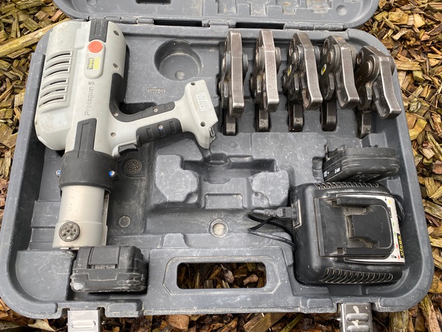 Wir vermieten das Akku-Modell im Set bestehend aus Presszange, 5 Backen/Zangen (15, 18, 22, 28, 35 mm), 2 Akkus und Akku-Ladegerät.